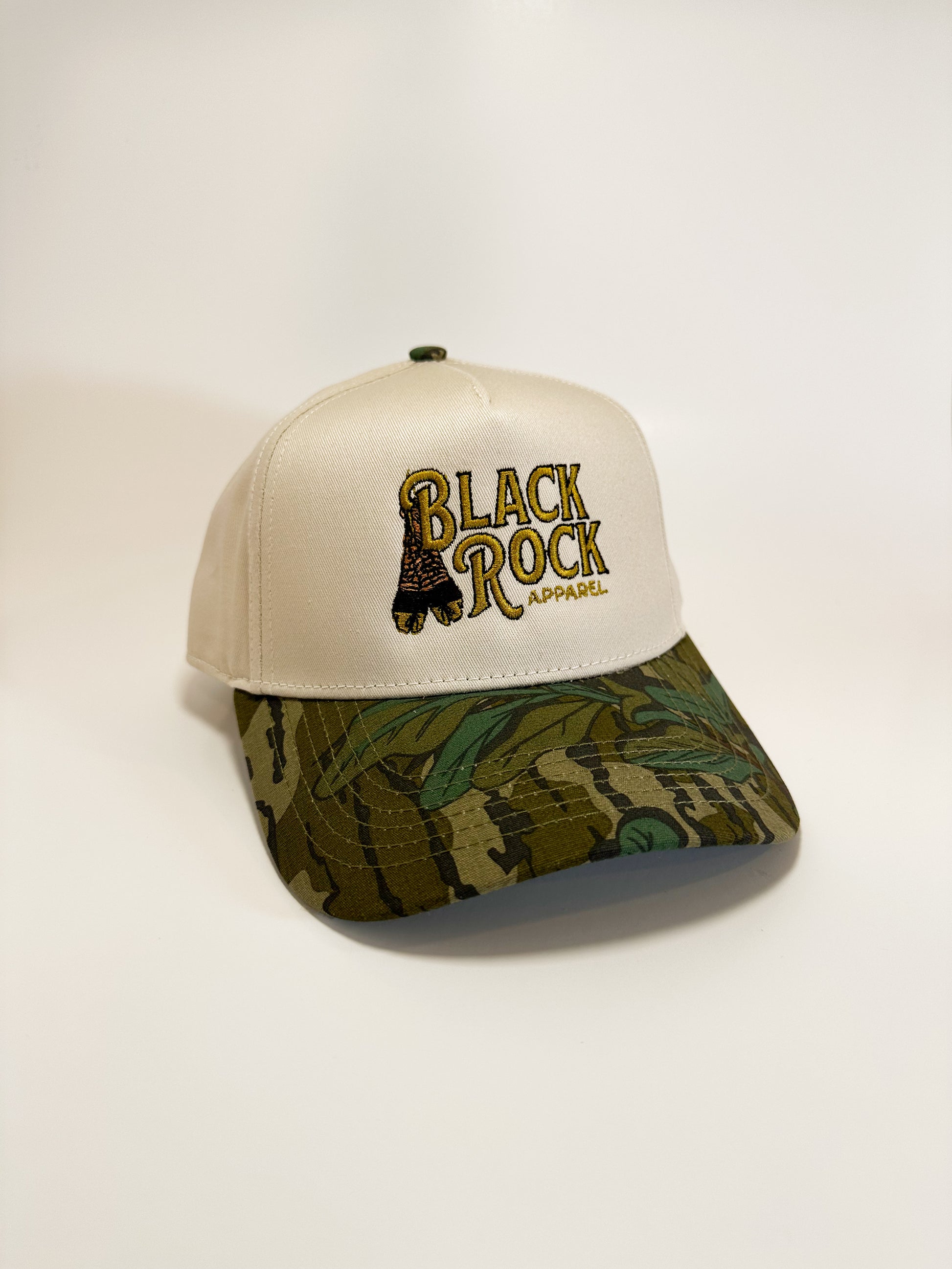 The Black Rock Feather Stack logo on a Lost Hat Co Greenleaf EA5Y Hyrbrid. A vintage classic sure to be an everyday favorite!